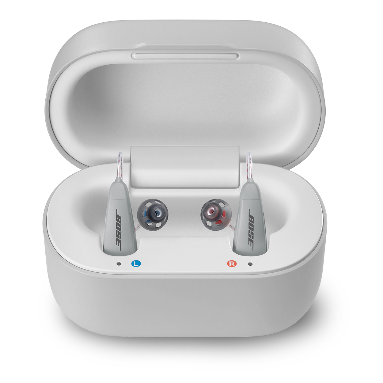 - 2 rechargeable hearing aids (left and right)